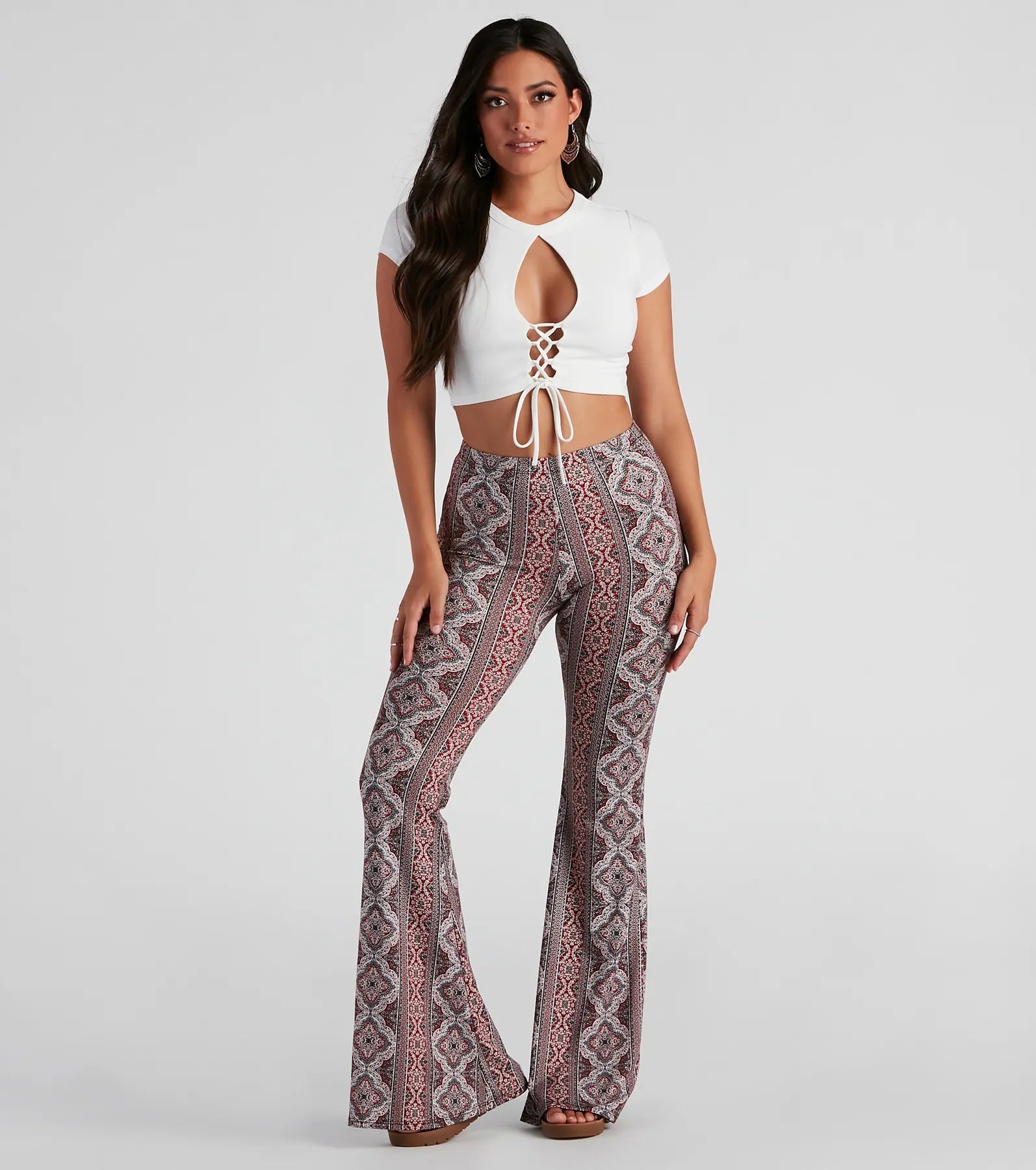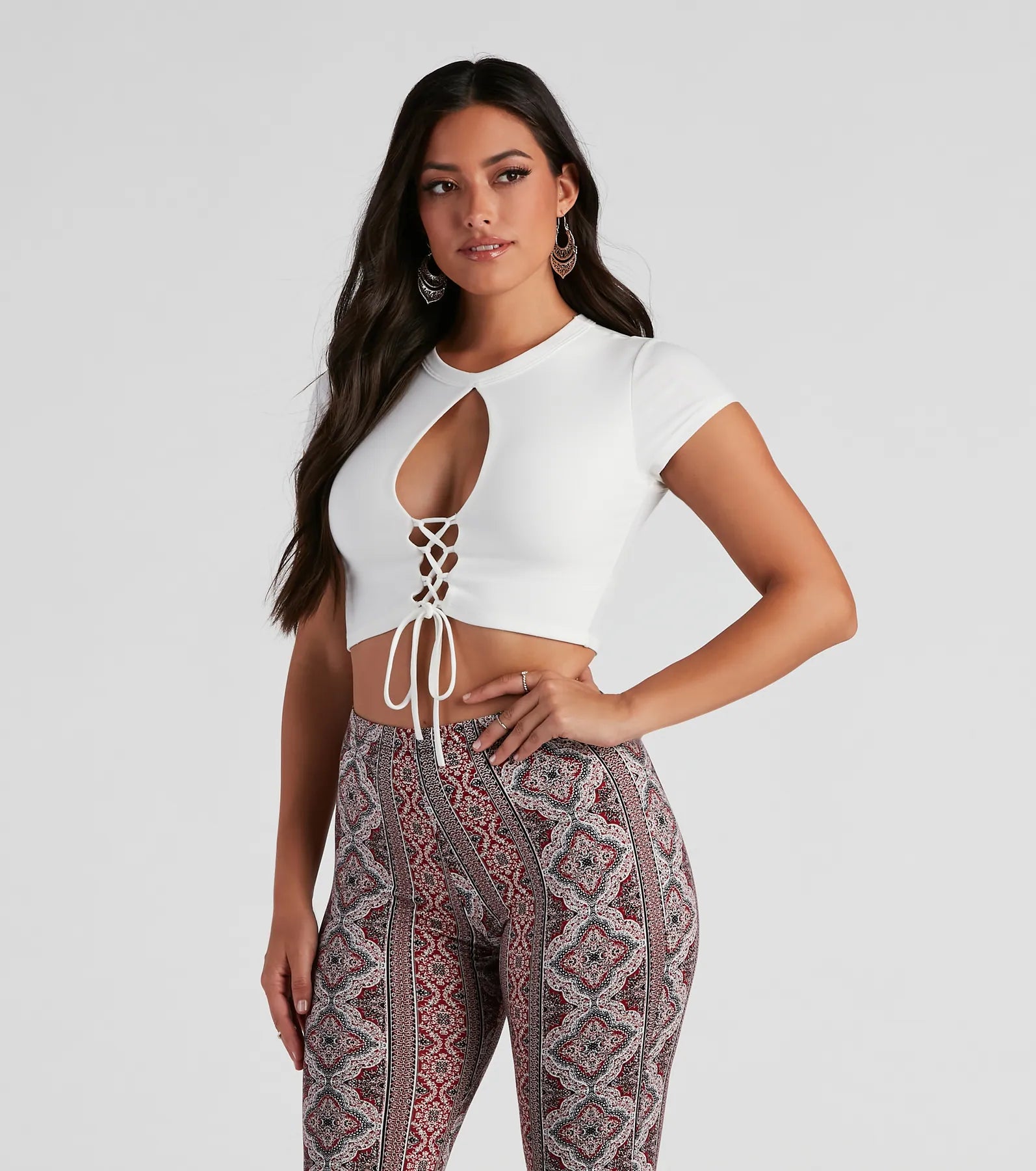 This crop top is a hot take on your basic tee! Featuring cap sleeves, a crew neck, and a center front slit with lace-up closure on brushed-knit fabric with plenty of stretch. Complete the look in high-rise for happy hour.