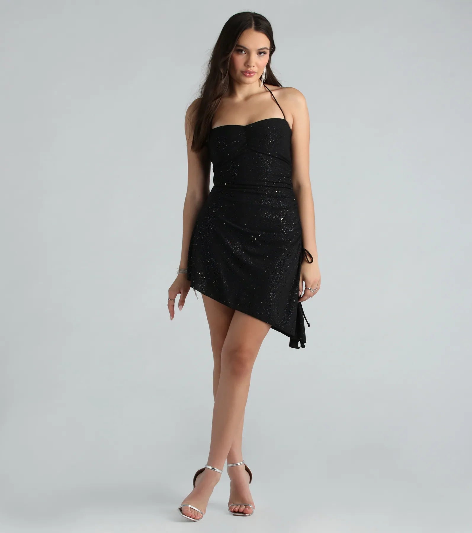 Live your best life in this glitter mini dress for birthdays or dressy nights out! The short dress features a halter neckline with tie-back closure, a ruched bust seam, a form-hugging fit, an asymmetrical mini-length hem with a flirty side slit, and an adjustable side drawstring so you can customize the style. The mini dress is crafted from a rainbow glitter mesh fabric with a stretchy knit lining. Complete the look with .