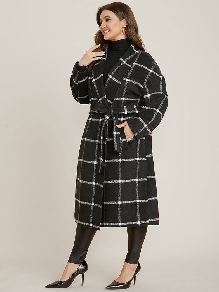 Plaid Lapel Collar Pocket Belted Open Front Coat