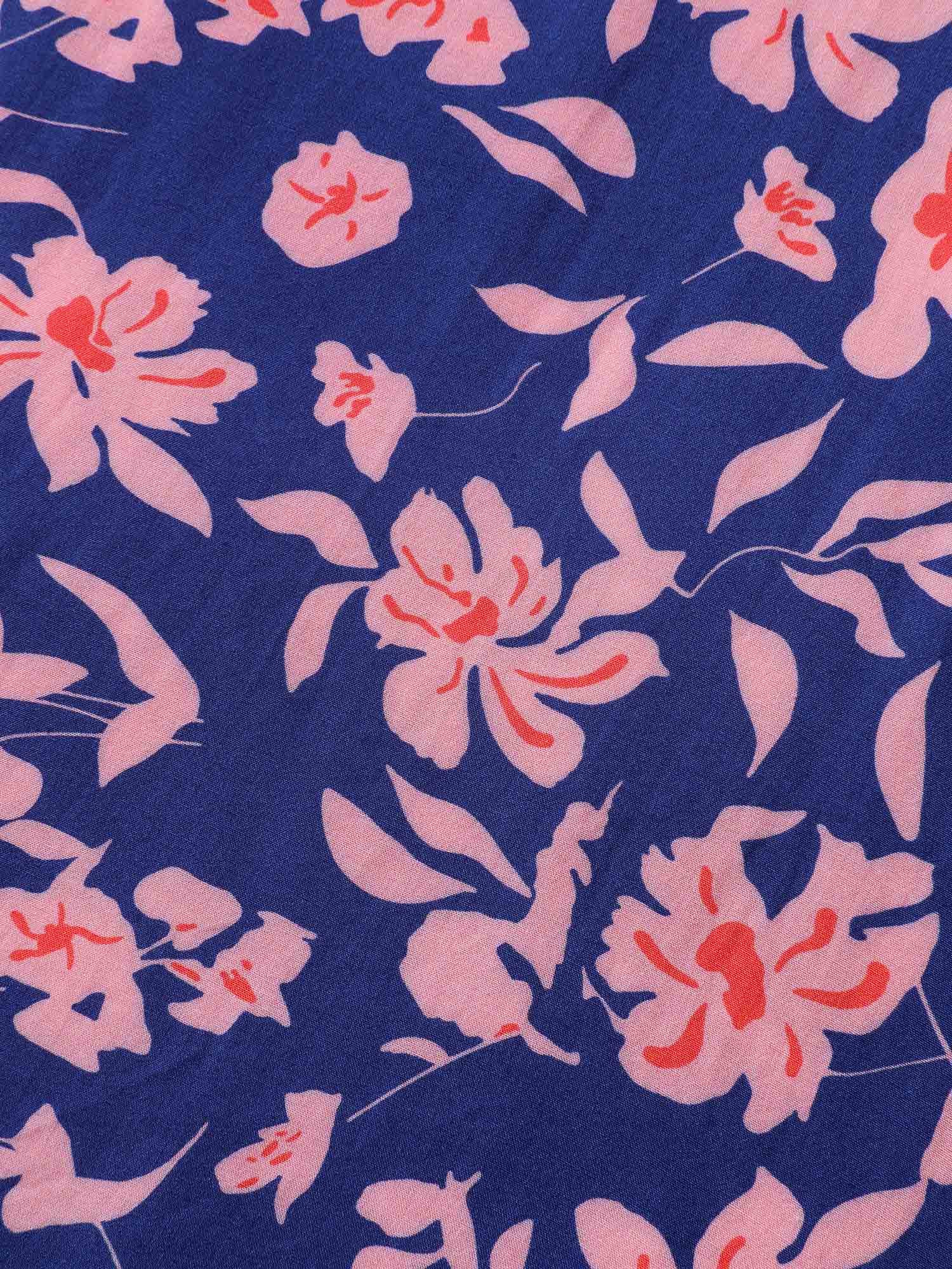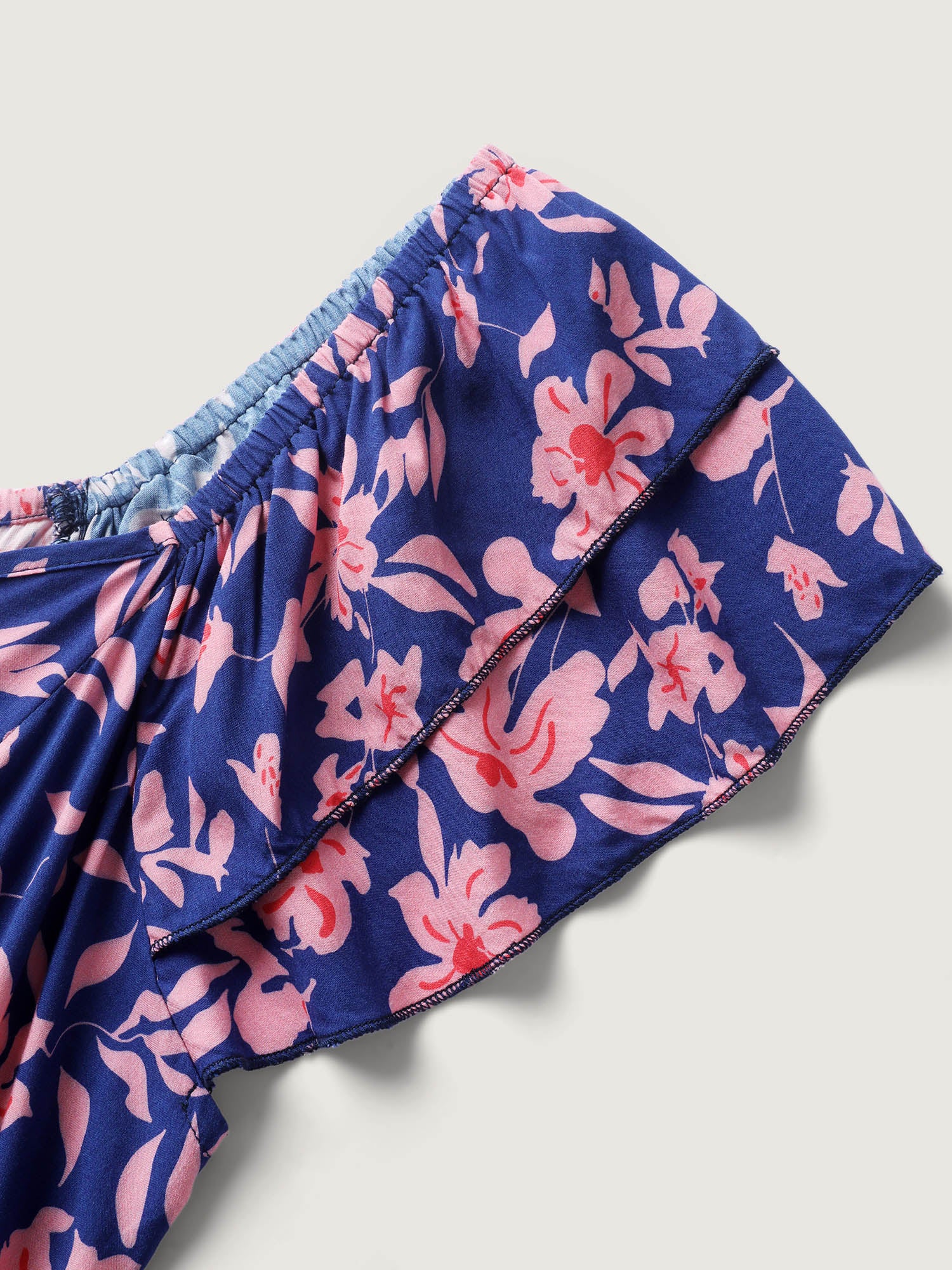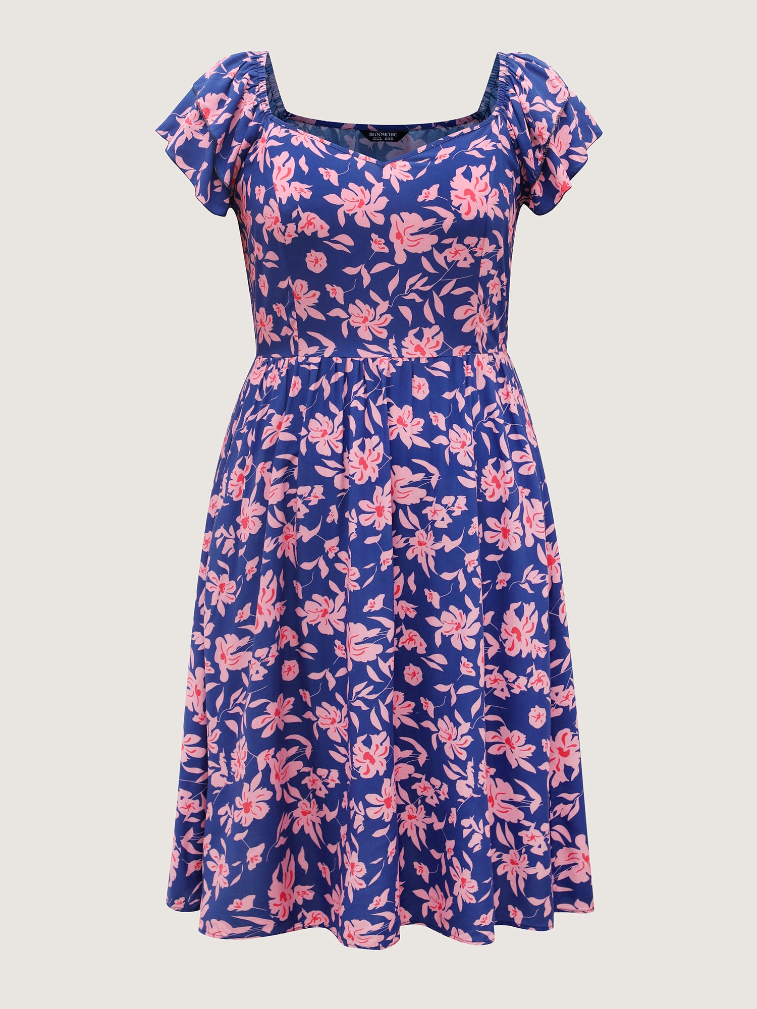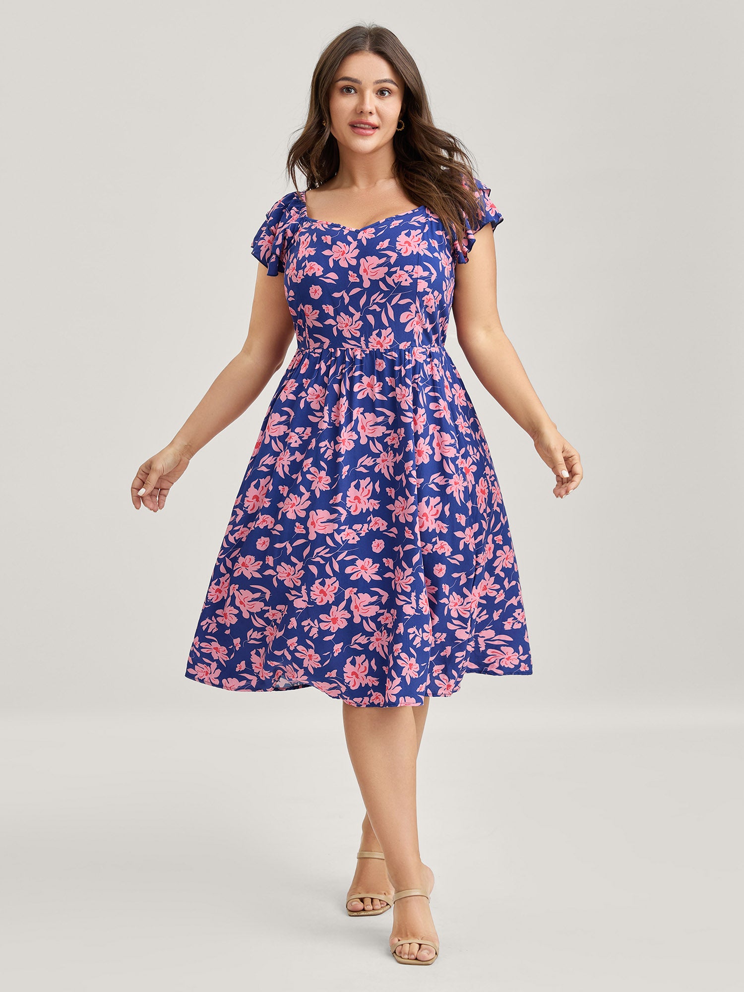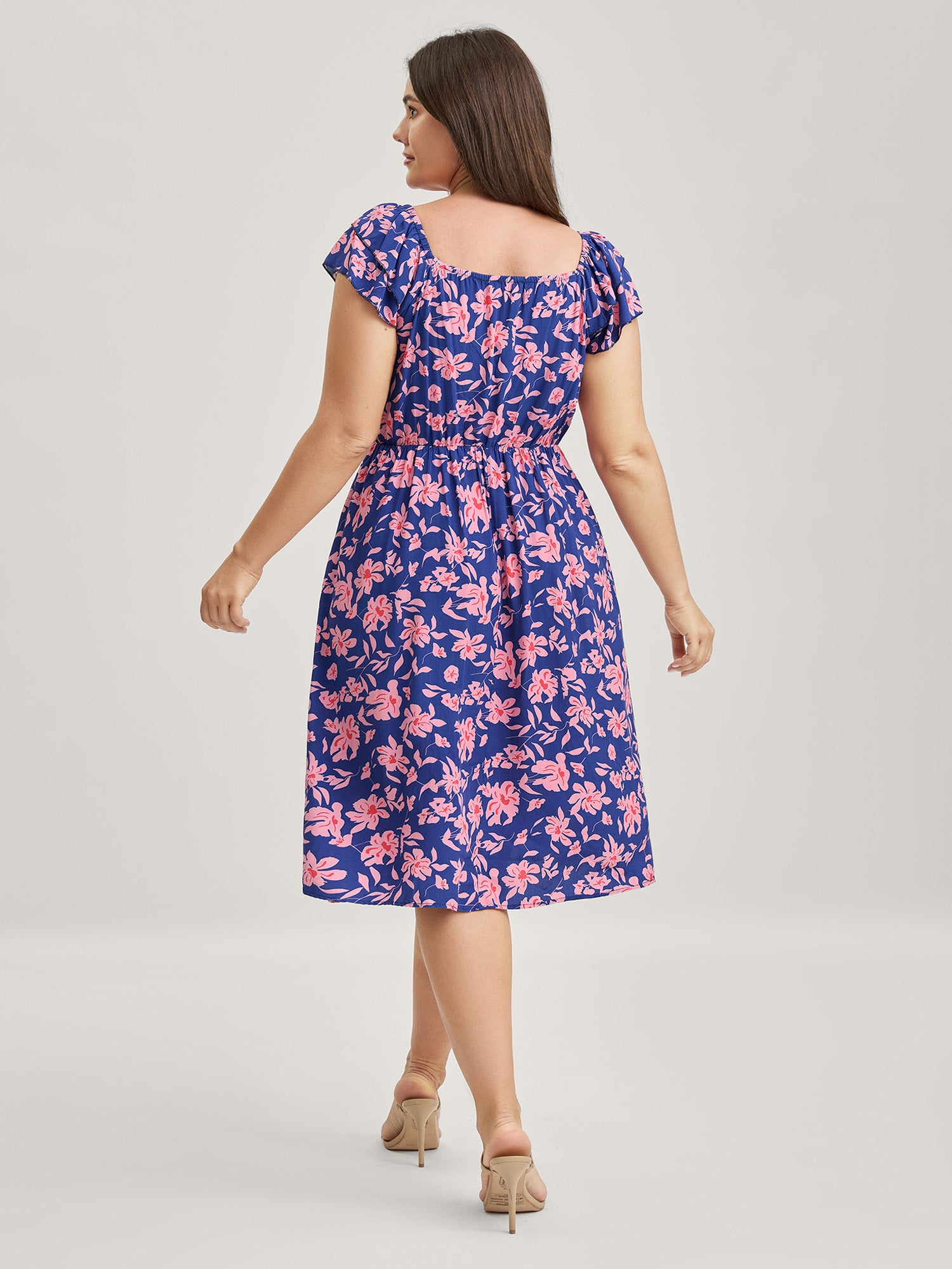 Rayon Silhouette Flower Ruffled Sleeve Midi Dress